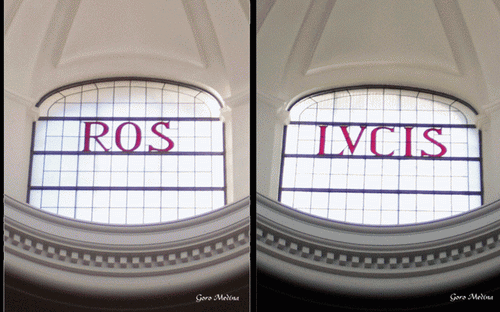En los ojos de buey de la linterna, se puede leer las siguientes inscripciones:
