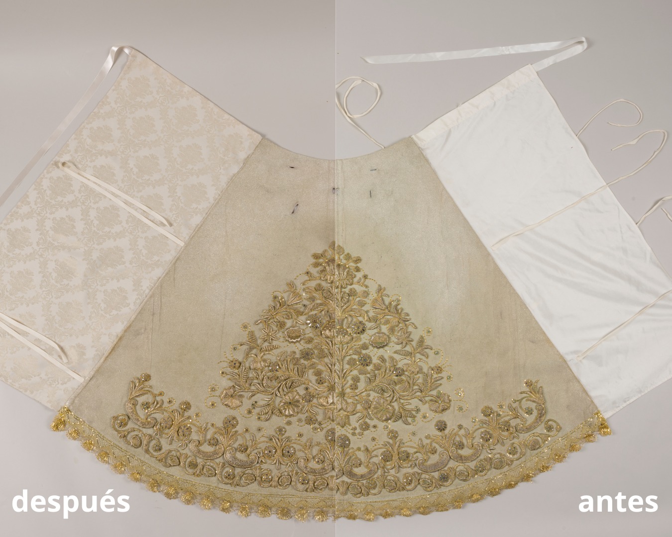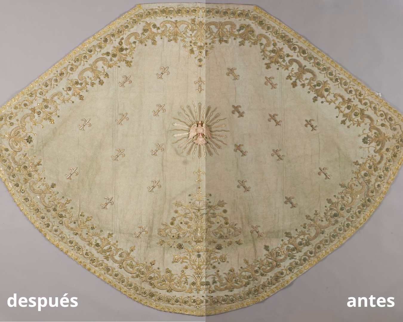 La intervención, que se ha desarrollado durante un periodo de siete meses en el Taller de Tejidos del IAPH, ha permitido reforzar y estabilizar las alteraciones que presentan los diferentes elementos constitutivos, tejido, bordado, blonda y forros.