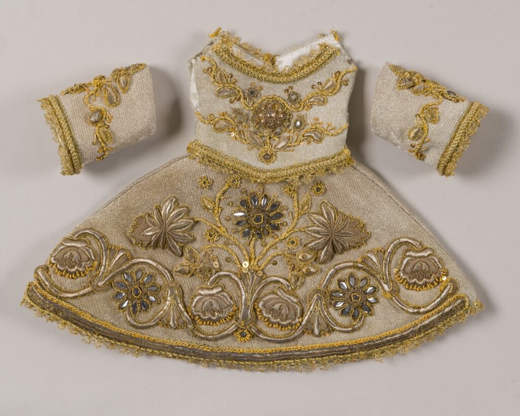 Este histórico traje de la Virgen está confeccionado en tejido de tisú de plata sobredorada con bordados de hilos metálicos dorados y ornamentación de espejuelos, lentejuelas, cordoncillos de briscado y blonda metálica. Su autoría es anónima y está datado anterior al 1919, situándolo a finales del siglo XIX. La paloma del Espíritu Santo en la zona central del manto fue realizada por Manuel Carmona en madera policromada y añadida en el año 1990.