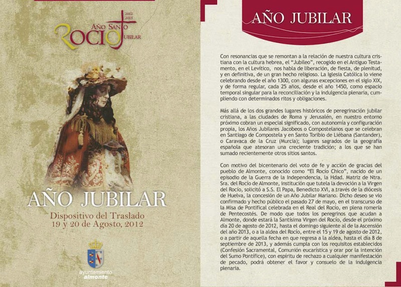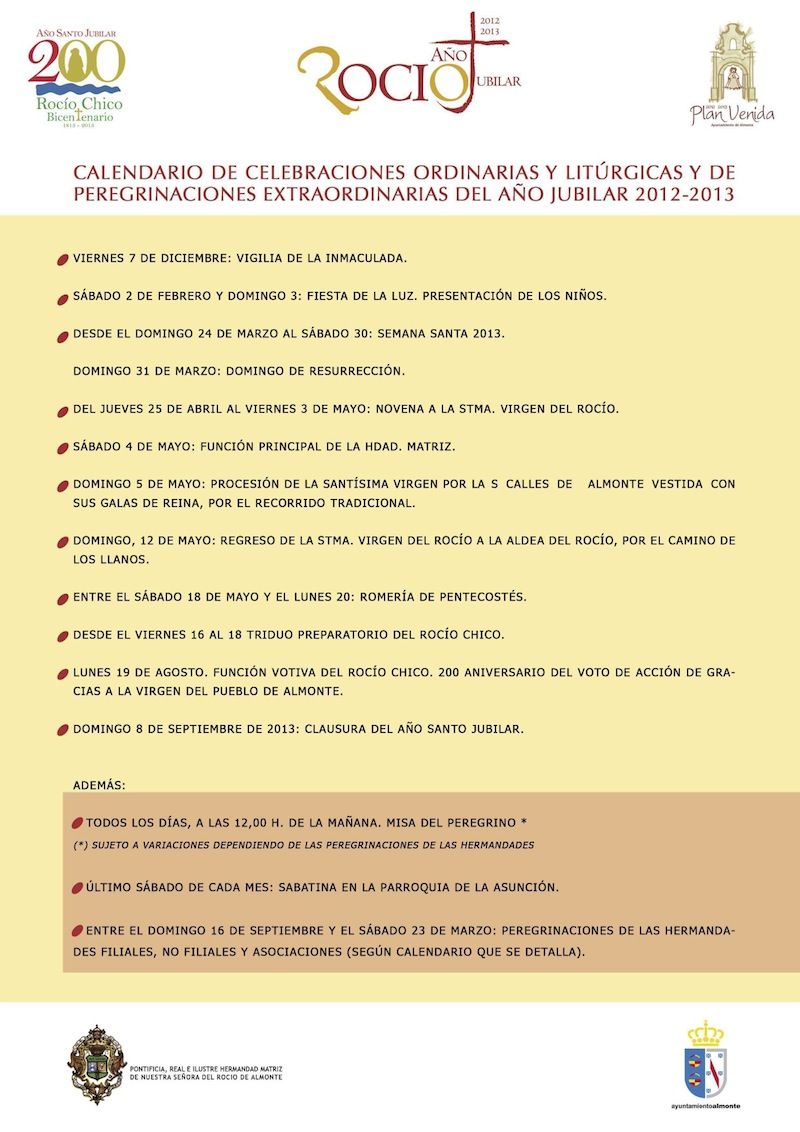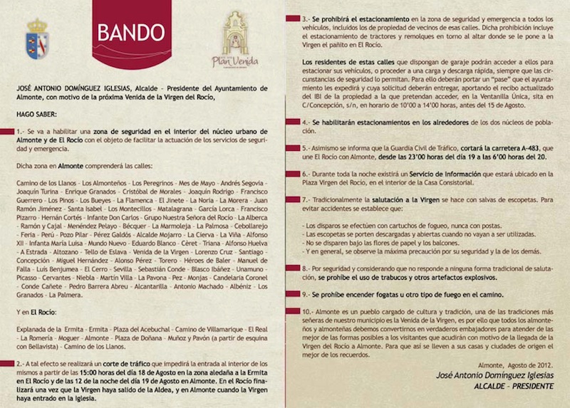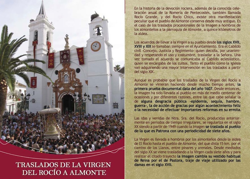 Planos y bando municipal sobre el Traslado 2012. En Almonte lo que se respira son nervios, impaciencia y muchas ganas, cuando termina la Romería del Rocío, Almonte comienza a soñar, aunque ya se comienza atrabajar casi un año antes, pasando la Romería y Feria, nada es igual, Almonte comienza a cambiar. En octubre, antes de la venida de la patrona, se comienza a hacer flores para engalanar las calles por las que recorrerá la Santísima Virgen del Rocío, una vez pasado el año nuevo, año de la venida, en abril, las mujeres de Almonte trabajan en el forrado de los arcos y templetes.