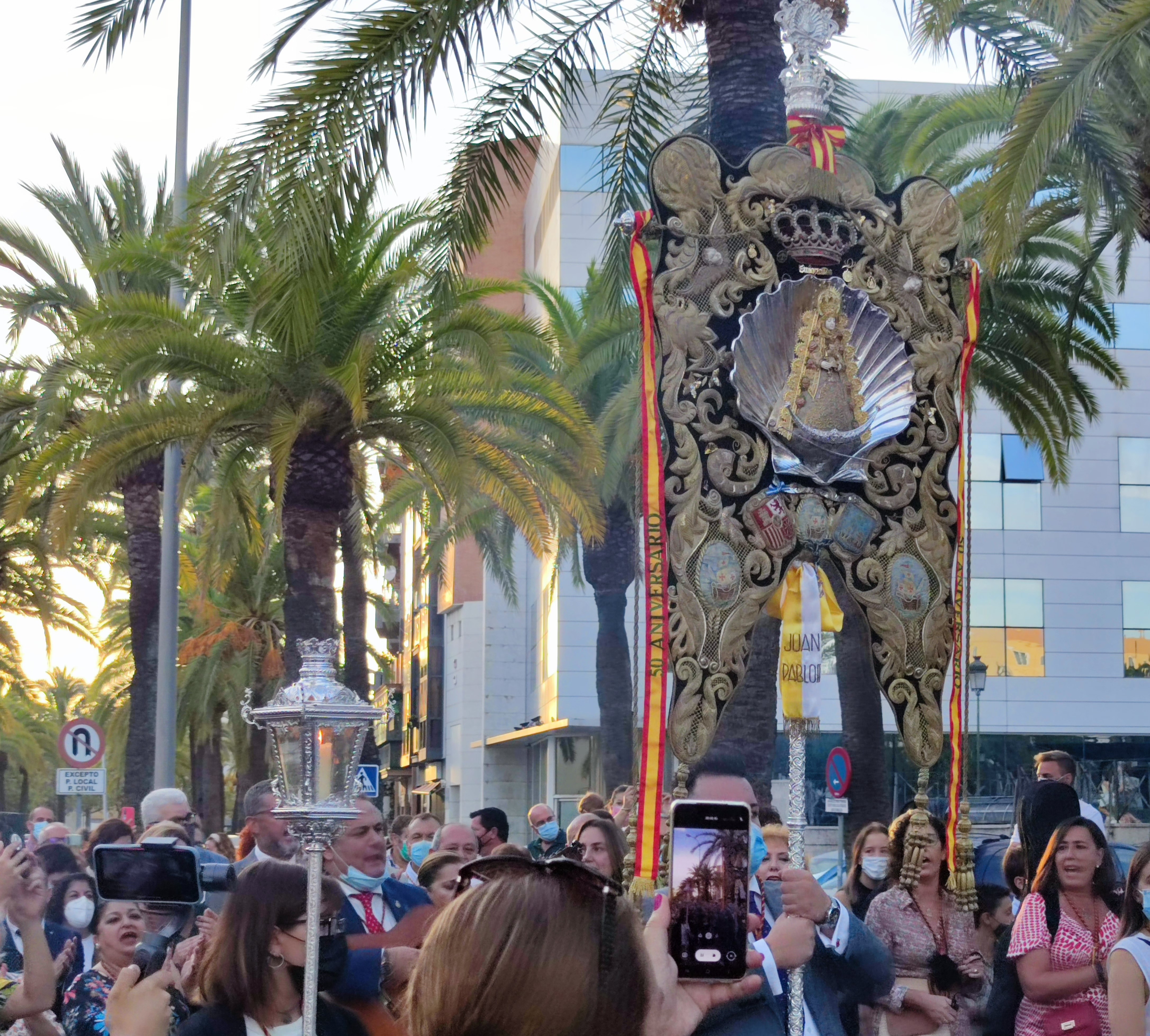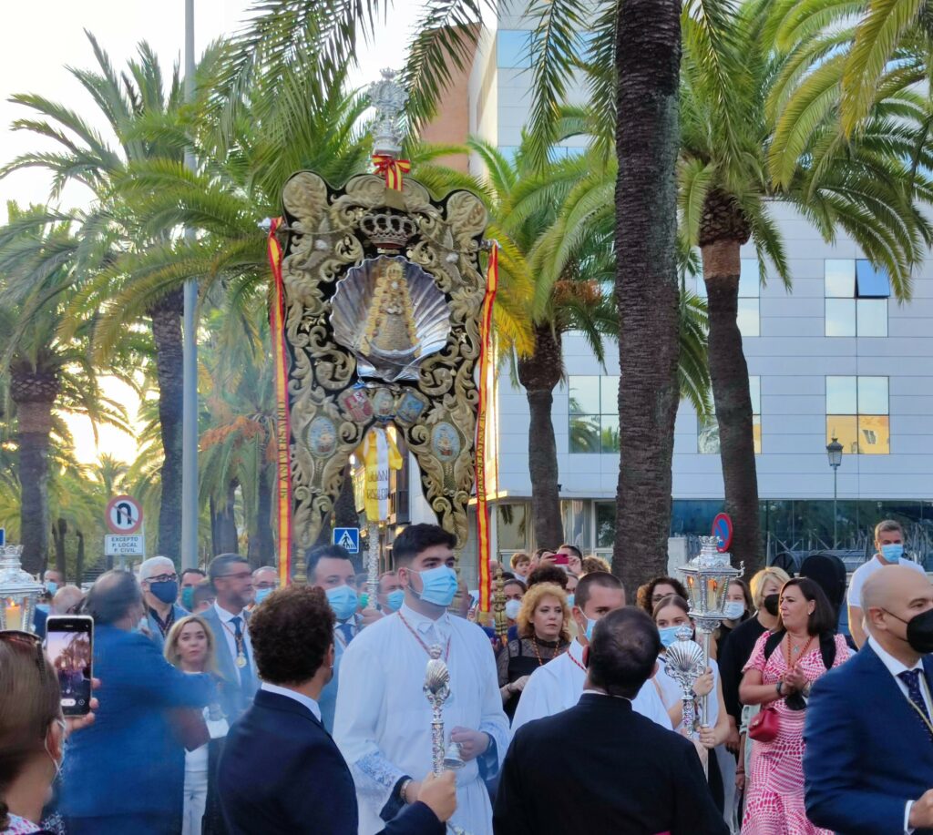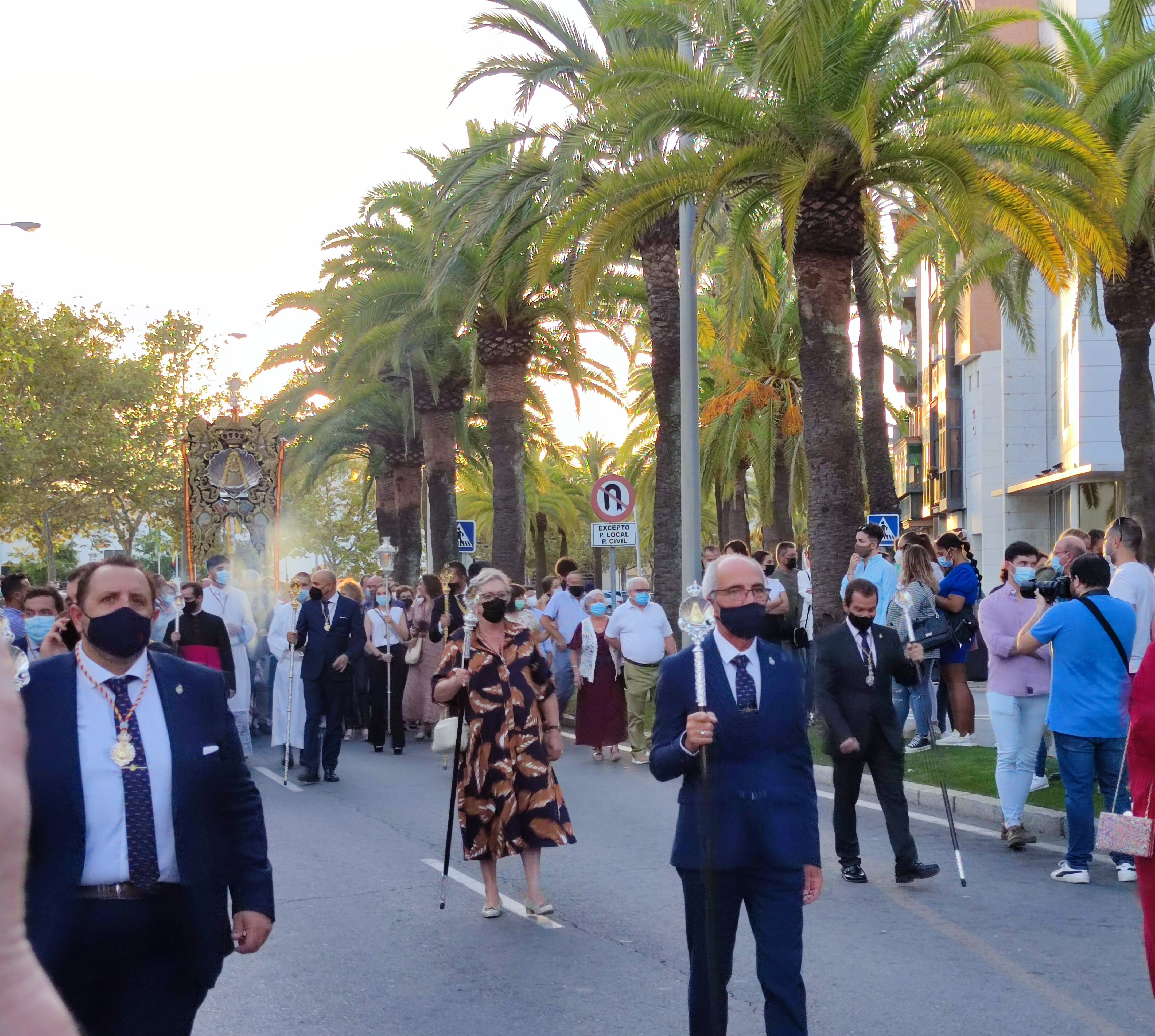 A las 19.30 horas se iniciaba la salida de los distintos guiones y estandartes que abrían la comitiva de la Concha Peregrina, que estuvo acompañada por autoridades civiles y militares, las hermandades de Huelva, Rociana, Ayamonte y Cartaya, así como cientos de hermanos y devotos que se sumaron a este caminar hacia la catedral en un recorrido en que contó en todo momento con los sones de la flauta y tamboril del grupo de tamborileros y las voces y sones de guitarra del coro de la hermandad.