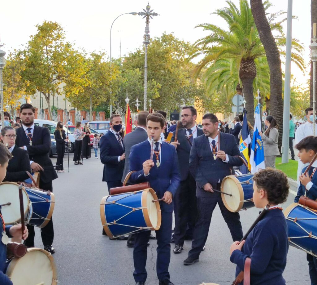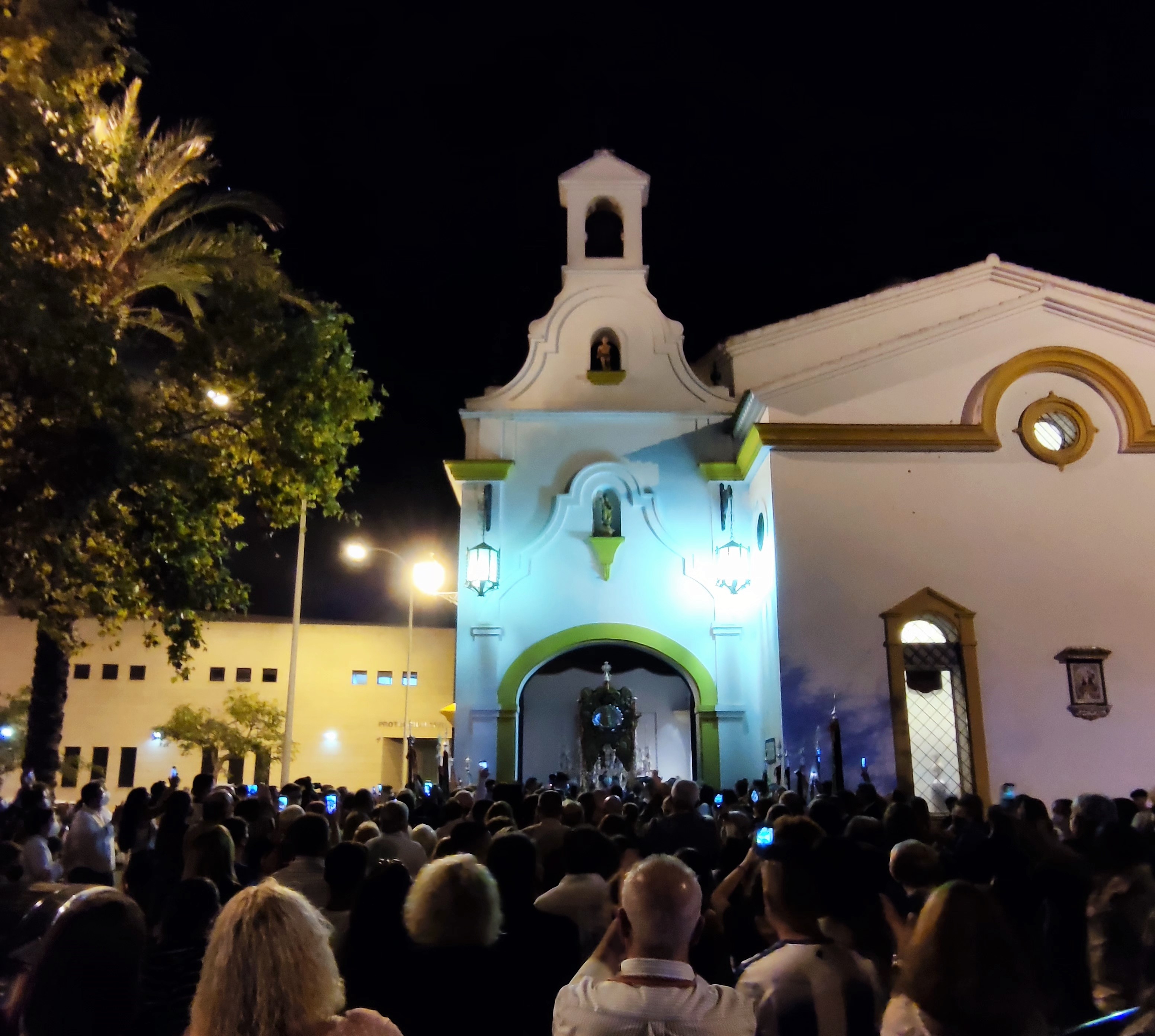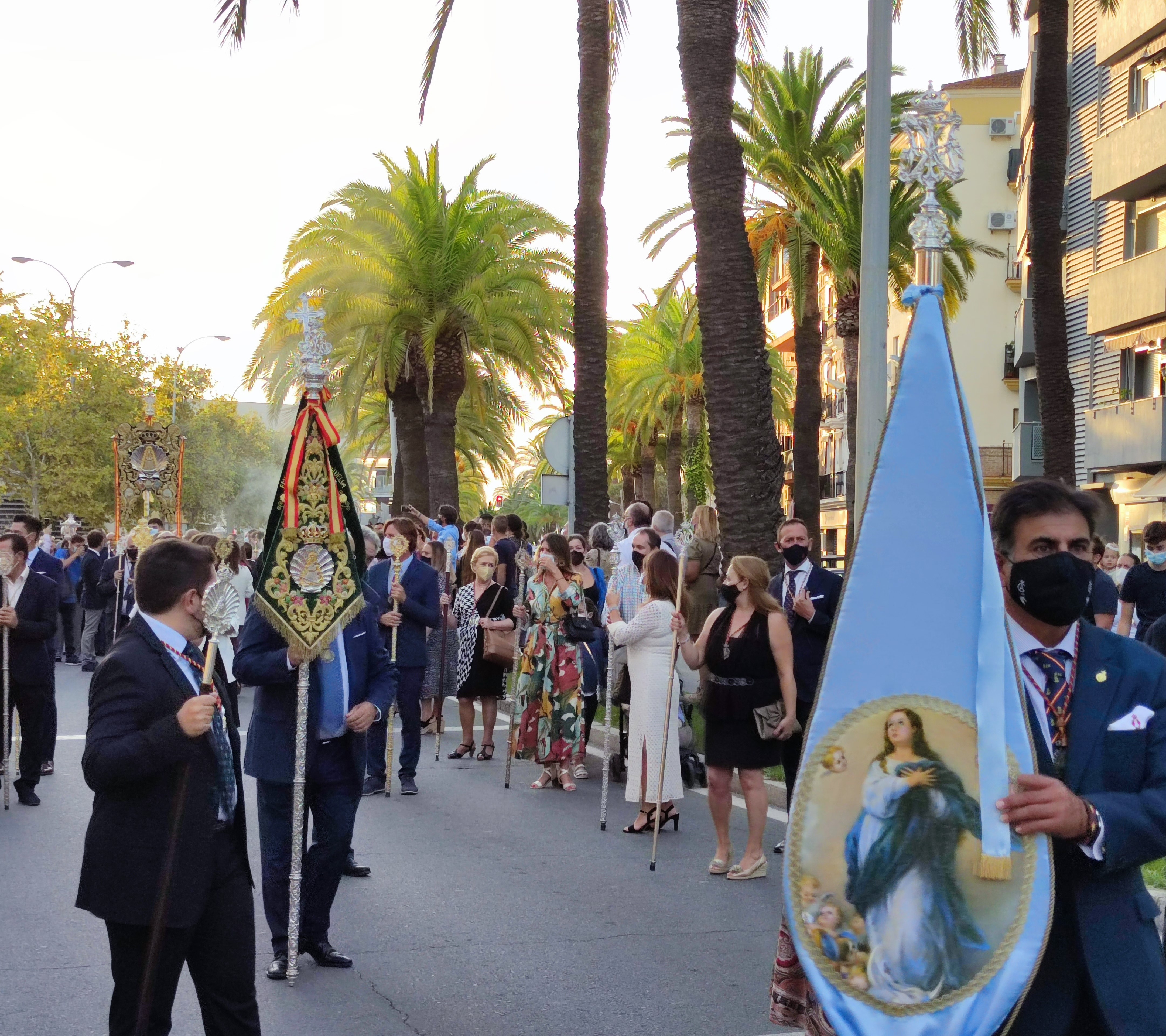 A las 19.30 horas se iniciaba la salida de los distintos guiones y estandartes que abrían la comitiva de la Concha Peregrina, que estuvo acompañada por autoridades civiles y militares, las hermandades de Huelva, Rociana, Ayamonte y Cartaya, así como cientos de hermanos y devotos que se sumaron a este caminar hacia la catedral en un recorrido en que contó en todo momento con los sones de la flauta y tamboril del grupo de tamborileros y las voces y sones de guitarra del coro de la hermandad.