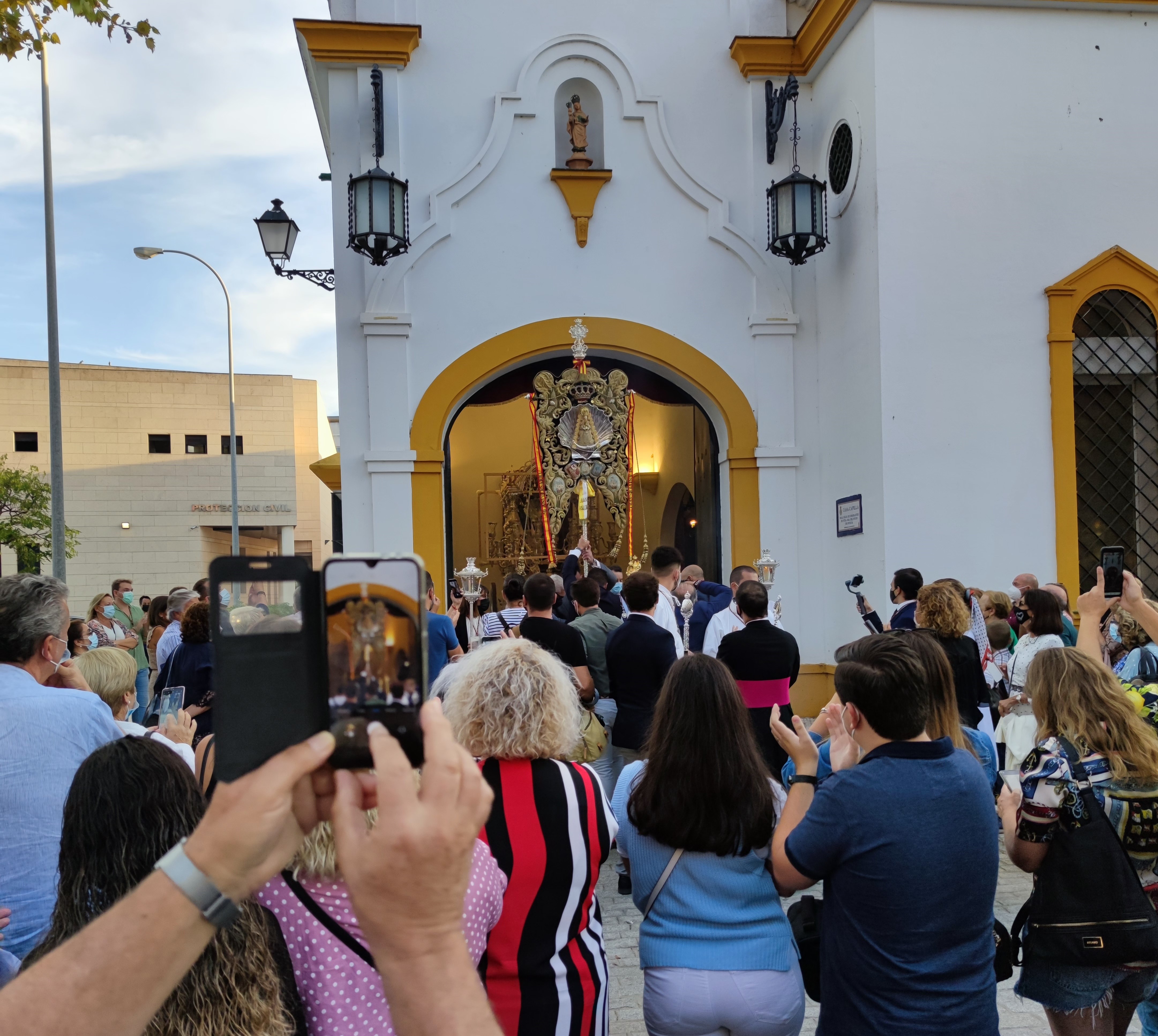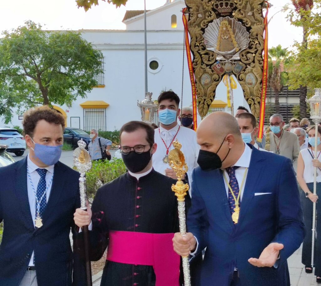 Antes de iniciar el traslado el presidente de la filial rociera Francisco José Garrido señaló que “este día era posible a que la situación sanitaria ha mejorado”, mientras que el hermano mayor José Antonio Ortiz Morano pidió “la ayuda y protección para los damnificados por las inundaciones de Lepe”, recordando que hoy se inicia por la hermandad una campaña de recogida de enseres, comida para bebés, artículos de aseo, alimentos no perecederos, material escolar, menaje, droguería. La Eucaristía, que contó con la participación del coro de la hermandad, estuvo presidida por el párroco de la Merced y director espiritual de la hermandad, Jaime Jesús Cano Gamero, agradeció la presencia de las autoridades y hermandades a la Misa de Acción, asimismo recordó durante su homilía el nacimiento de la hermandad en la ciudad alemana de Bocholt. Asimismo, señaló que “hoy Huelva se llena de Rocío” con este inicio de la celebración del cincuentenario de la filial rociera.