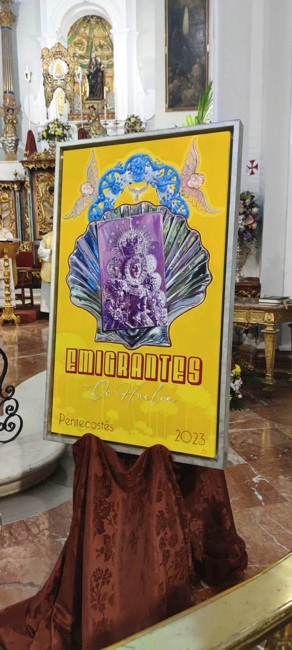 Por su parte, el cartelista describió de la siguiente forma su obra: “La singular e identificativa concha de plata del Simpecado de la Hermandad de Emigrantes cobija a la icónica estampa de la Virgen del Rocío que preside el antiguo Simpecado, el que dio origen a la corporación en Alemania para venir a quedarse en su Huelva. La Venera es coronada por la embocadura de uno de los característicos carros tradicionales de flores teñidas del «blanco y azul de la bandera de Huelva», conteniendo a la Blanca Paloma del Espíritu Santo sobre la Virgen, como el Lunes de Pentecostés, mientras los dos querubines de marfil del bendito Simpecado de Emigrantes flanquean el conjunto. Destaca en tono rojo sobre un fondo gualda la tipografía con el nombre de la hermandad -EMIGRANTES- en los colores del cordón de la medalla, que son los de la añorada bandera de tierras españolas de sus fundadores, donde además se adivinan las siluetas recortadas de los pinares de Gato, cobijando el texto del cartel”.