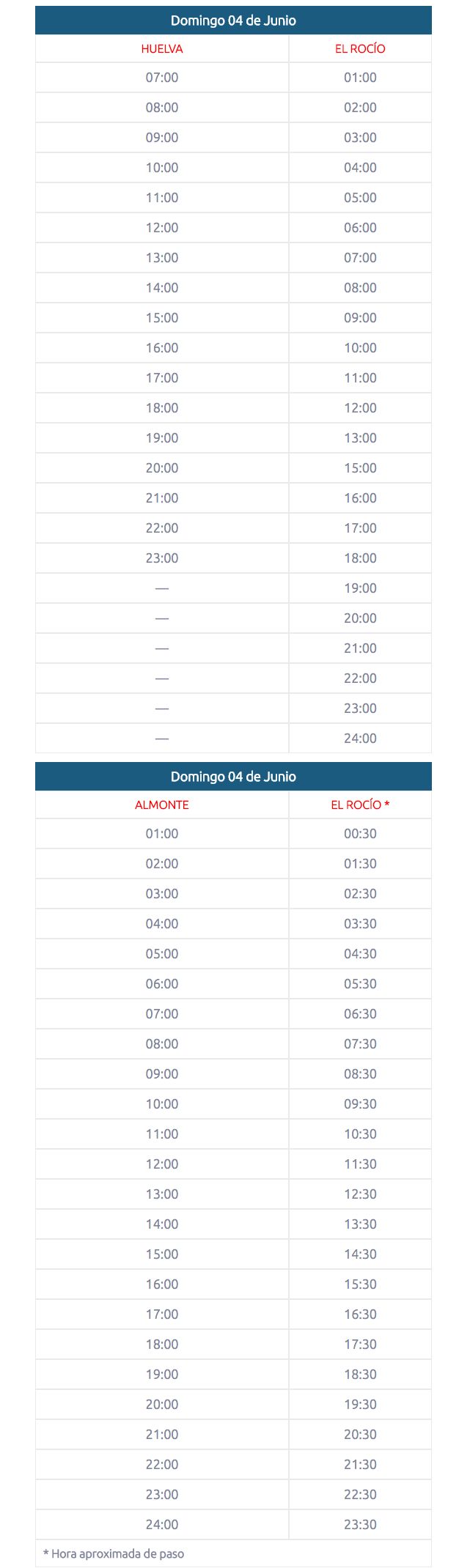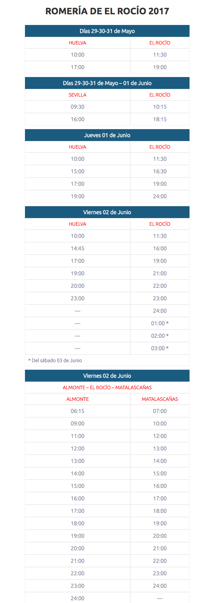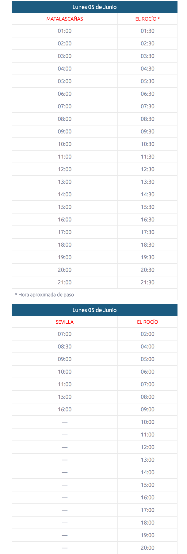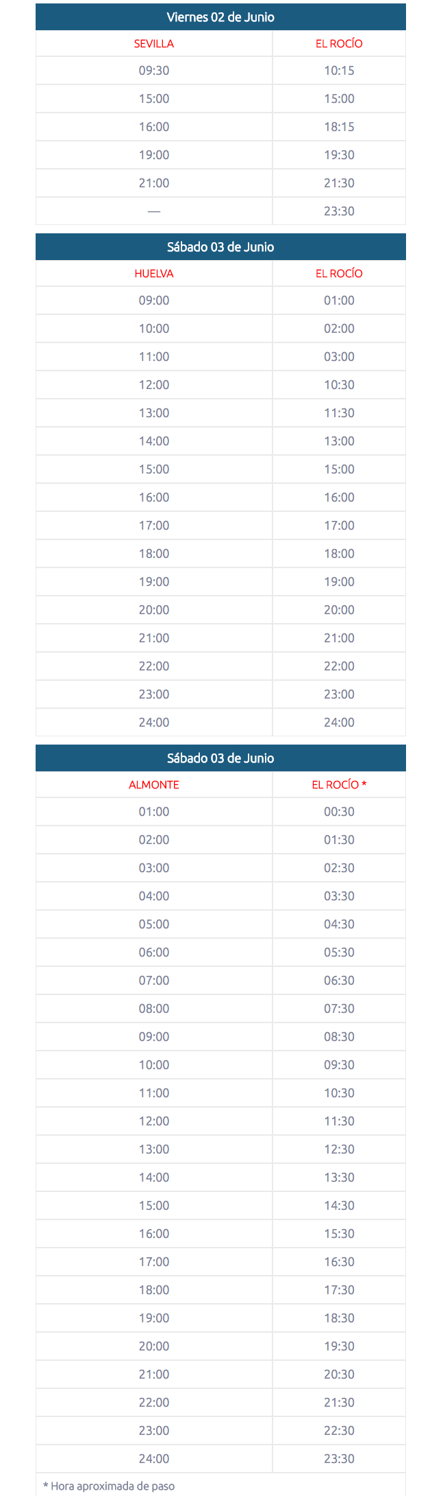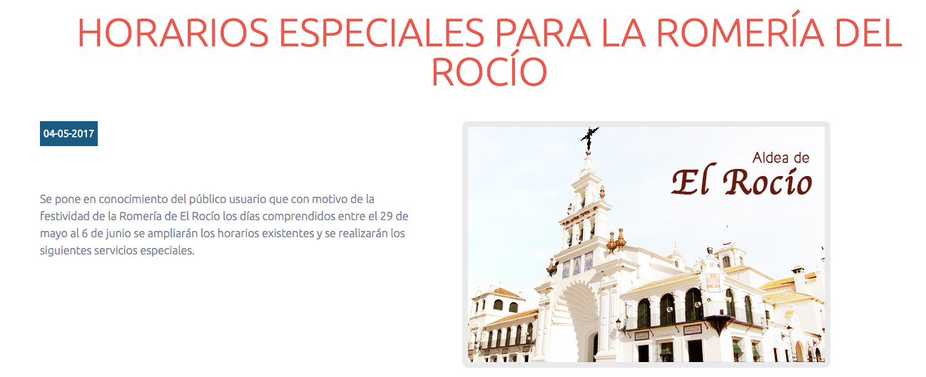 Se pone en conocimiento del público usuario que con motivo de la festividad de la Romería de El Rocío los días comprendidos entre el 29 de mayo al 6 de junio se ampliarán los horarios existentes y se realizarán los siguientes servicios especiales.