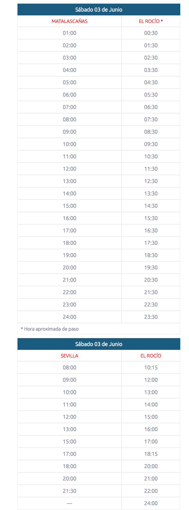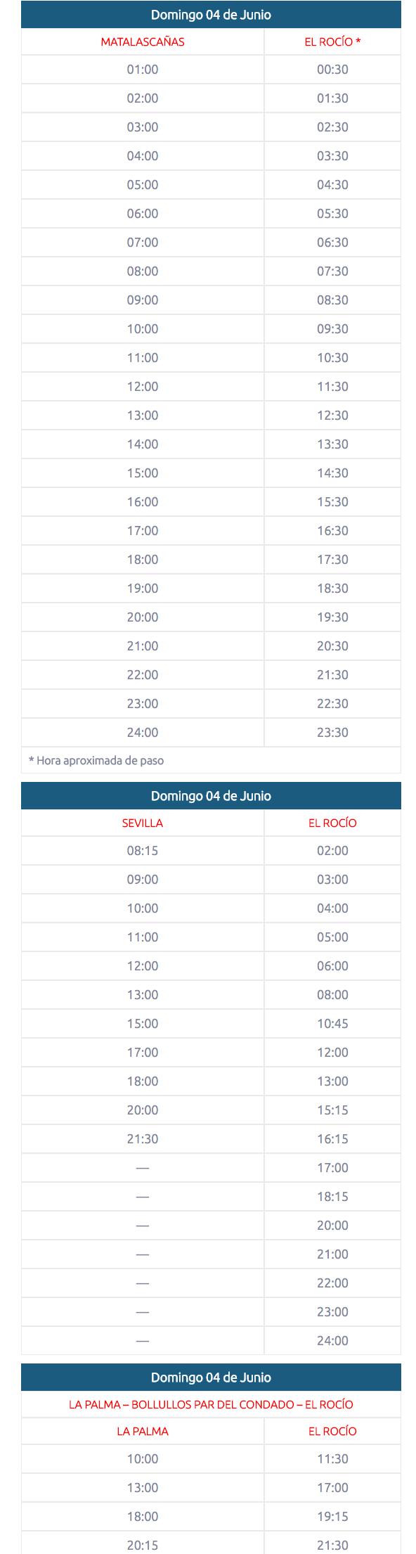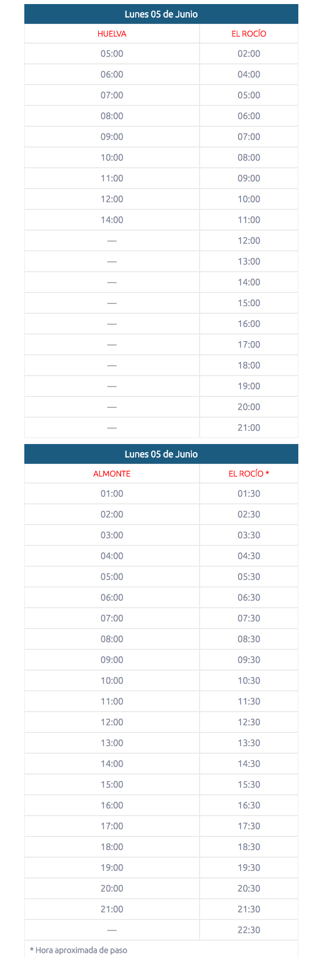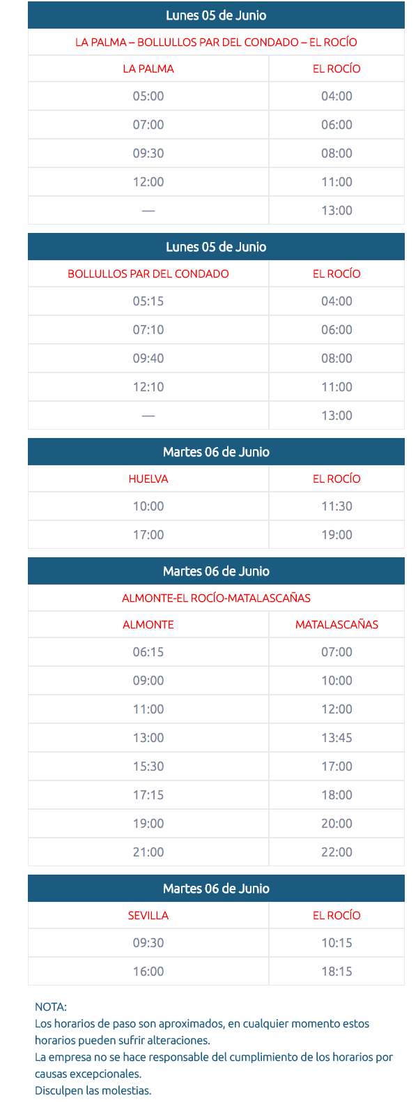 Se pone en conocimiento del público usuario que con motivo de la festividad de la Romería de El Rocío los días comprendidos entre el 29 de mayo al 6 de junio se ampliarán los horarios existentes y se realizarán los siguientes servicios especiales.