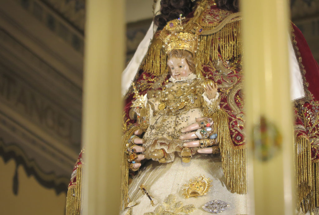 Hoy comienzan los cultos del Rocío Chico en la Parroquia almonteña. La Virgen del Rocío ha amanecido hoy vestida de Pastora por las hermanas camaristas. Luce el histórico traje de los Montpensier, donado por la condesa de París, Isabel Francisca de Orleans y Borbón, el sombrero realizado por los Hermanos Benítez y la esclavina más antigua que se conserva de la Virgen, del siglo XIX. El Niño aparece ataviado con un traje de finales del siglo XVIII, de tul, espejuelos y con aplicaciones de oro. Luce la corona de la Coronación Canónica de 1919.