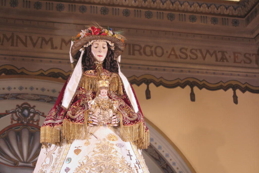 El atuendo elegido nos recuerda que este es el modo tradicional de ver a la Virgen del Rocío en agosto en Almonte, recuperando una estampa de principios del siglo XX, que a su vez nos recuerda un lienzo anónimo del siglo XIX conservado en una casa almonteña, que constituye el documento gráfico más antiguo conservado de la Virgen con esta vestimenta.