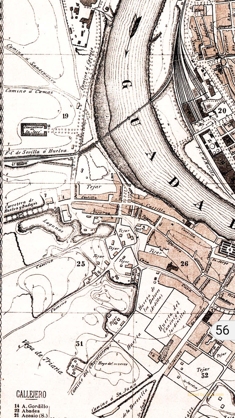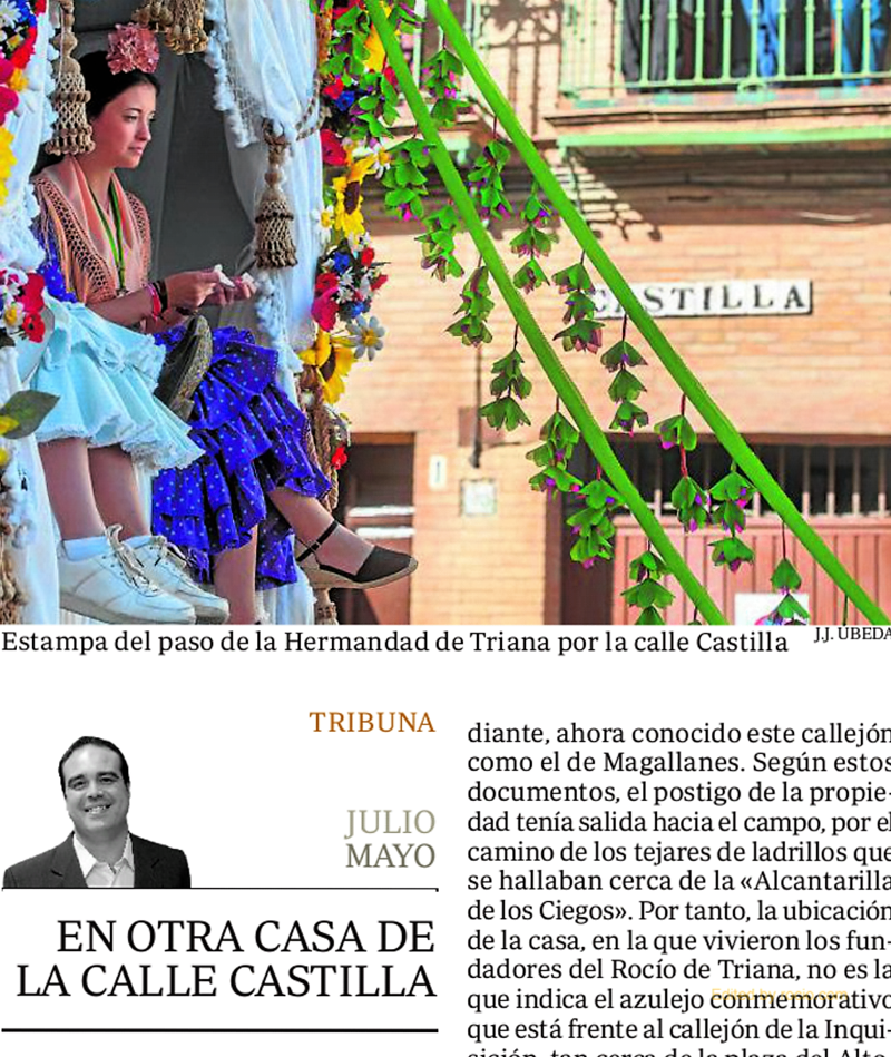 Ha sido determinante el hallazgo de hasta dos testamentos distintos del matrimonio, en los que quedan recogidas diversas descripciones del entorno urbano de la casa. Por detrás, colindaba con un tinajón de bueyes, propio de los titulares, que daba a la entonces llamada callejuela del Estudiante, ahora conocido este callejón como el de Magallanes. Según estos documentos, el postigo de la propiedad tenía salida hacia el campo, por el camino de los tejares de ladrillos que se hallaban cerca de la «Alcantarilla de los Ciegos». Por tanto, la ubicación de la casa, en la que vivieron los fundadores del Rocío de Triana, no es la que indica el azulejo conmemorativo que está frente al callejón de la Inquisición, tan cerca de la plaza del Altozano. Se corresponde con una distinta, situada al otro extremo en dirección a la capilla del Patrocinio, tras sobrepasar la parroquia de la O. Se sitúa, justamente, en la confluencia de las calles Castilla con la de Alvarado, en el número 103 de Castilla, junto a Chapina (Plaza de Matilde Coral).