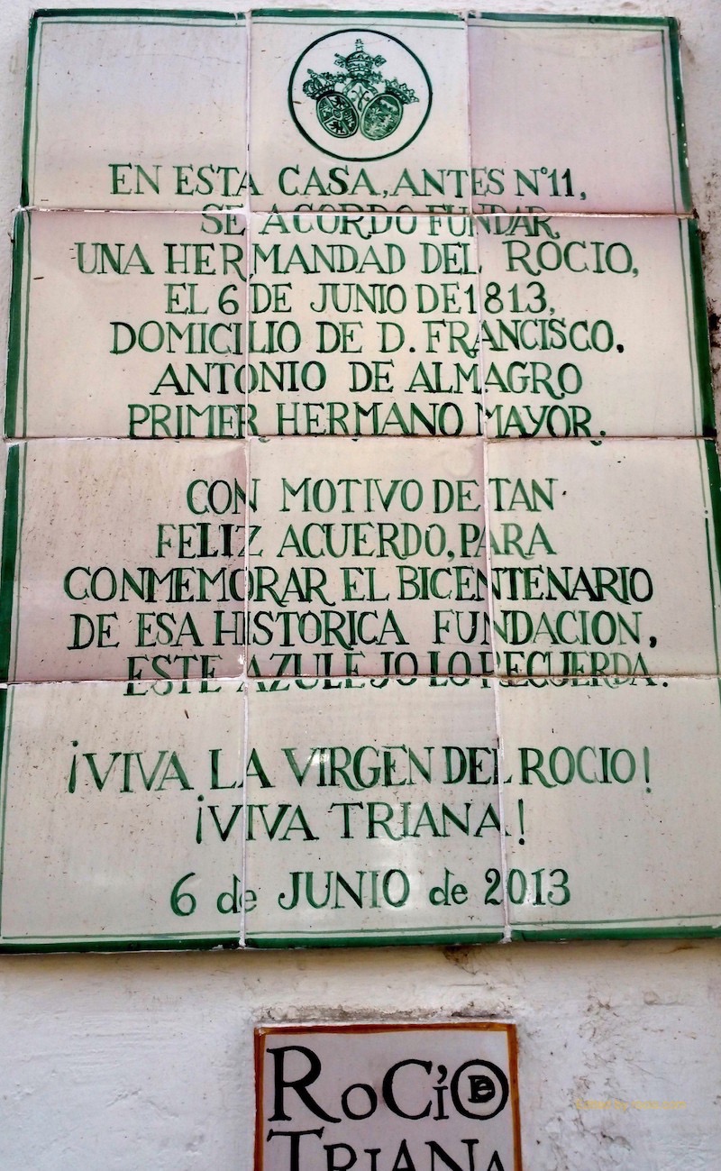 La ubicación de la casa en la que vivió el matrimonio fundador del Rocío de Triana se ha fijado tradicionalmente en un inmueble de la calle Castilla, que hasta hace muy pocos años ha sido el número 11, aunque hoy es el 9. Don Francisco Antonio Hernández y doña María del Carmen Tamayo, nacidos en el propio barrio de Triana y no en Villamanrique de la Condesa, como se ha venido sosteniendo, fueron sus primeros promotores. En el año 2013 quedó reconocido el domicilio con la colocación de un mural cerámico que conmemora su acto fundacional, acaecido el año 1813. Es verdad, que en la documentación obrante, tanto en el archivo de la propia hermandad, como en las partidas de defunción de los fundadores, aparece como número de la residencia el 11. Pero, a raíz de nuestros trabajos de investigación en estos años, hemos podido comprobar que la numeración se correspondía con otro tramo de la calle, vinculado a la feligresía de la Iglesia auxiliar de la O. Antiguamente, la numeración de las casas se repetía por sectores, dentro de una misma calle, y era distinta a la actual. En uno de los padrones conservados en la parroquia de Santa Ana, fechado en 1817, el matrimonio consta asentado en el tramo tercero de la O, en una vivienda marcada con el número general 110.