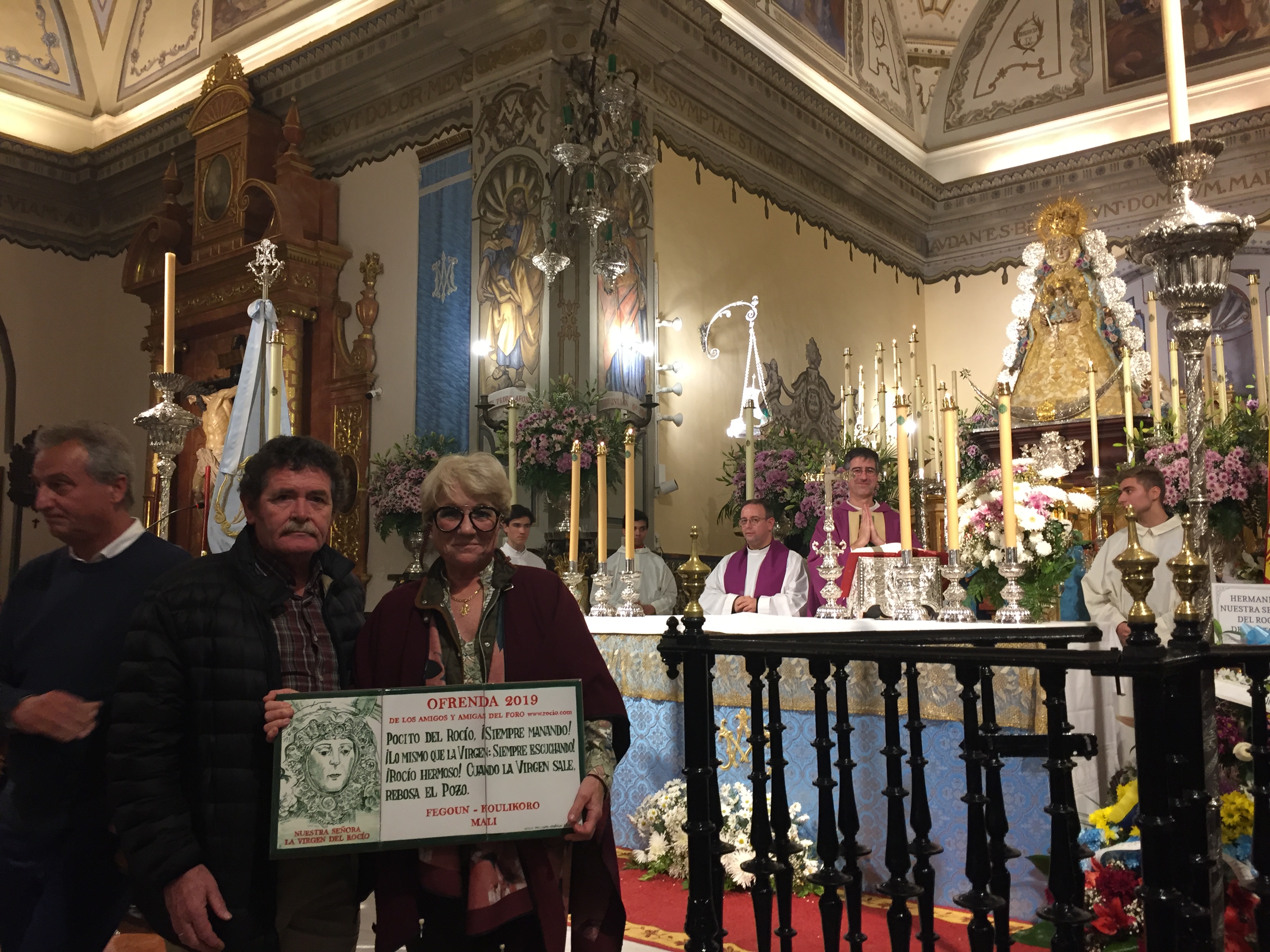 El pasado día 6 de diciembre estuvimos en la parroquia de la Asunción de Almonte y tras superar una serie de inconvenientes, ajenos a nuestra voluntad, pudimos en un sencillo acto, entre el final de la Misa de Almonte y el rezo de la Salve, entregar a Paloma Rodríguez y a Alberto Cruzado, en nombre de las Hermanas Franciscanas de Kouilokoro en Mali, el el azulejo conmemorativo que adornará nuestro Pozo.