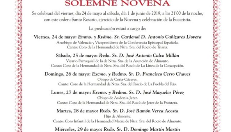 En cumplimiento de una arraigada tradición y de lo dispuesto en nuestras Reglas, la Hermandad Matriz celebrará, como preparación espiritual para la Venida de la Virgen, nueve Rosarios …