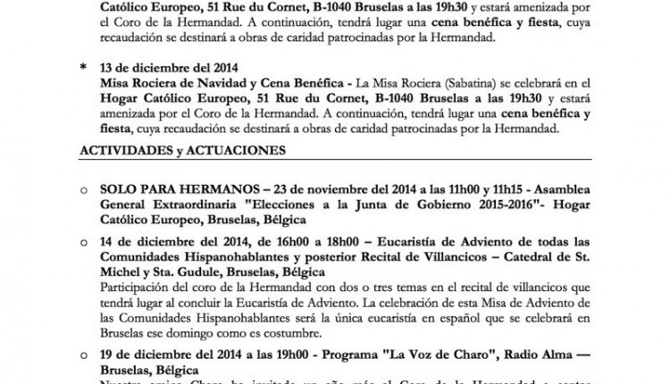 La Hermandad de Bruselas nos remite la Agenda rociera del mes de enero así como el calendario de sabatinas de enero a junio 2015.