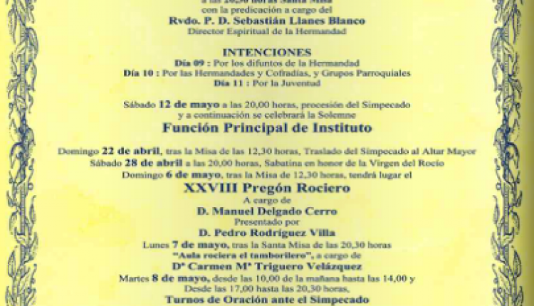 La Hdad. de Algeciras celebra el sábado 28 de abril el Pregón Rociero y los días 9,10 y 11 de mayo el Solemne Triduo en …
