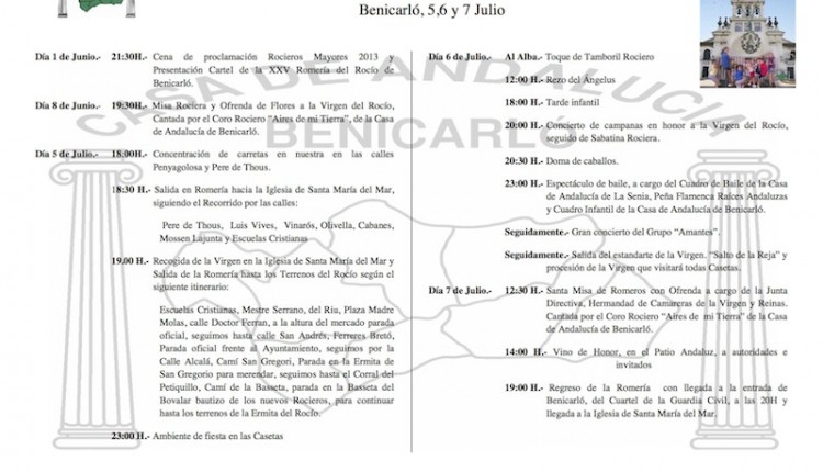 Cartel y Programación de Festejos, para la próxima Romería del Rocío de Benicarló que se celebrará los próximos días 6, 7 y 8 de Julio …