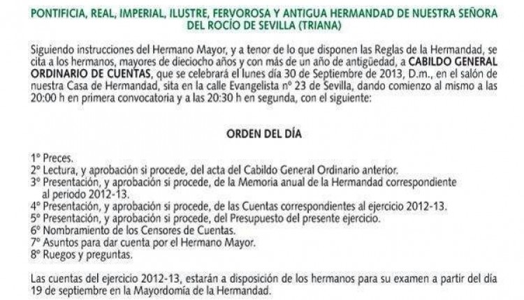 De orden del Presidente tengo el honor de convocar a los hermanos mayores de 18 años, con un año de antigüedad, al Cabildo General Extraordinario …