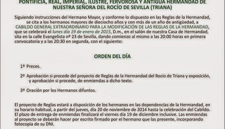 La Hermandad de Triana cita a todos los hermanos mayores de 18 años y con un año de antigüedad al Cabildo General Extraordinario para la Modificación de …