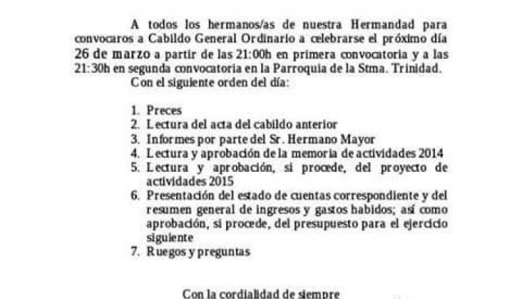 La Hermandad de Chiclana celebra Cabildo General Ordinario hoy jueves 26 de marzo de 2015 a las 21 horas en primera convocatoria.