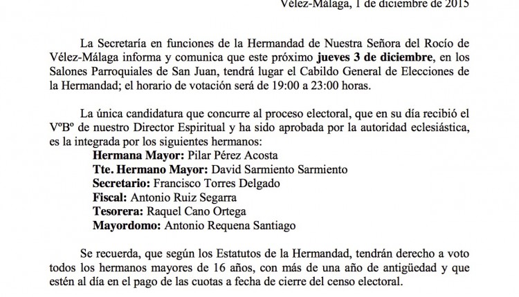 Cabildo de Elecciones que tendrá lugar en nuestra Hermandad el próximo jueves día 3 de diciembre de 2015 con la única candidatura presidida por Doña …
