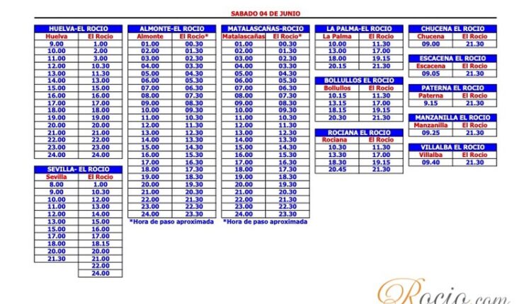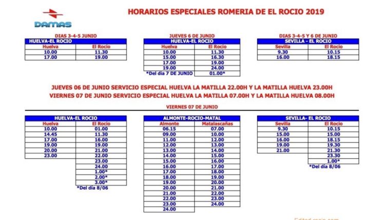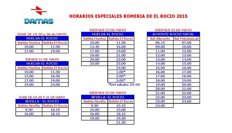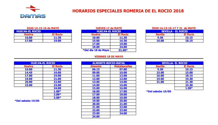 HORARIOS ESPECIALES ROMERIA DE EL ROCIO 2018 Empresa DAMAS de Huelva COMPRA ONLINE