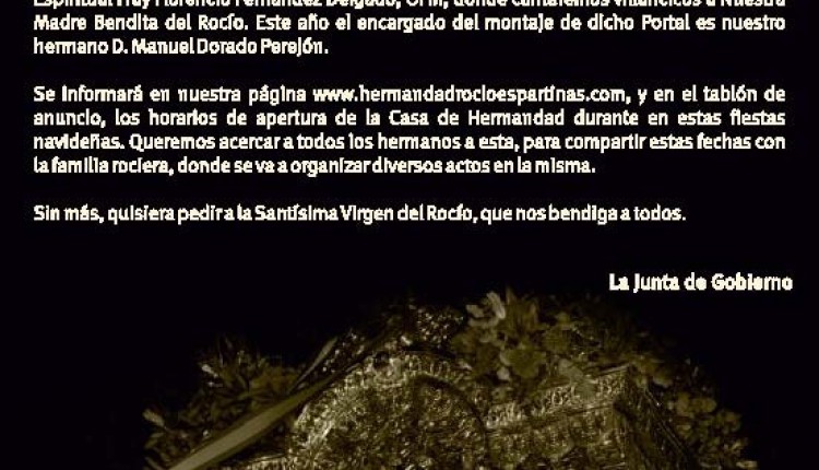 Queridos hermanos y devotos de la Santísima Virgen de Rocío: Informaros que hoy día 02/01/2011,podremos disrutar de la compañía del Coro de Campanilleros de Espartinas …
