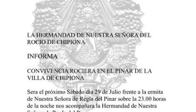 La Hermandad de Chipiona celebra una Convivencia Rociera el próximo 29 de julio de 2017 en el Pinar de la Villa de Chipiona, a partir de la …