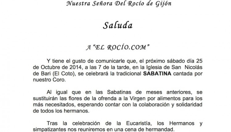 El Secretario de la Hermandad de Nuestra Señora del Rocío de Gijón Saluda Y tiene el gusto de comunicarle e invitarle a la Solemne y Anual Peregrinación …