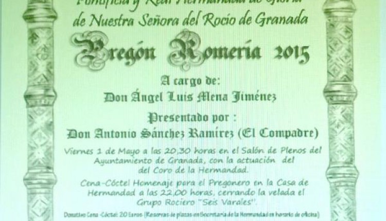 La Hermandad de Granada celebra su Pregón Rociero 2015 a cargo de D. Ángel Luis Mena Jiménez el día 1 de mayo de 2015.
