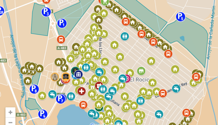 Mapa creado por Alfonso Díaz Marín para facilitaros la búsqueda en la aldea del Rocío de las casas de Hermandad, fuentes de agua potable, aparcamientos, …