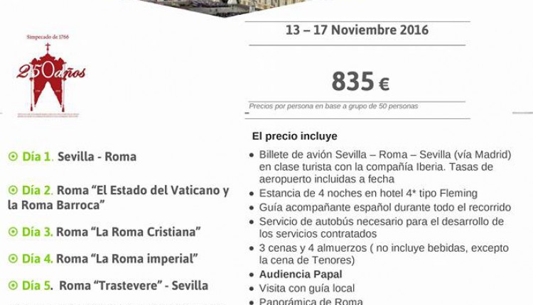 La Hermandad de Villamanrique organiza una Peregrinación a Roma del 13 al 17 de noviembre de 2016 con motivo del 250 Aniversario del II Simpecado de 1776. …