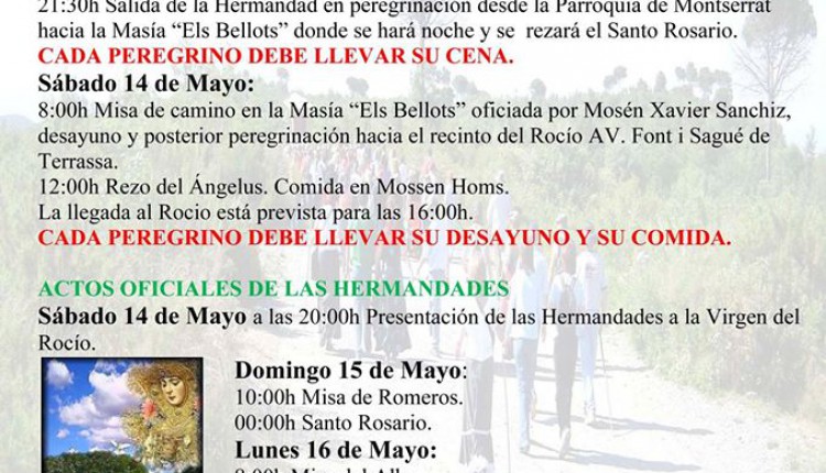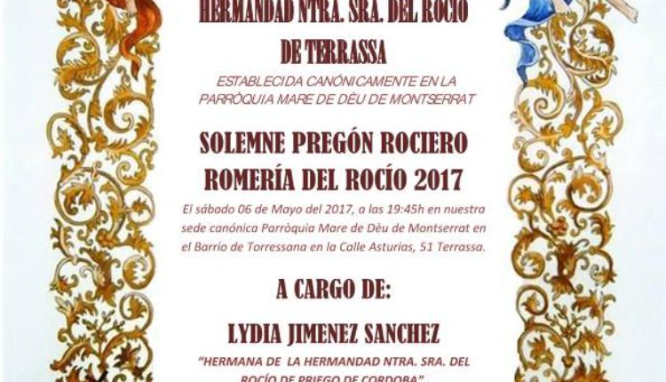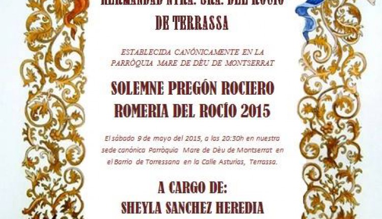 La Hermandad de Terrassa celebra su Pregón Rociero el sábado 6 de Mayo a las 19:45h en su sede canónica Parròquia Mare de Dèu de Montserrat …