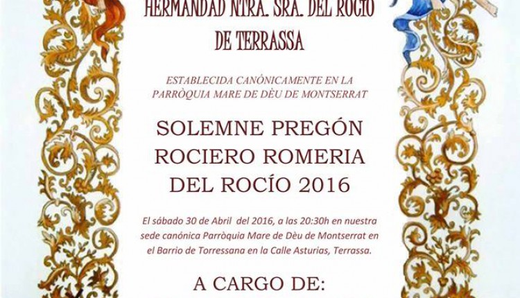 La Hermandad de Terrassa celebra su Pregón Rociero a cargo de Juan Carlos Casado Linares el sábado 30 de abril de 2016.