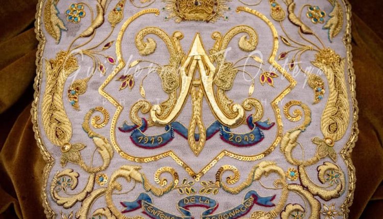 El pañito «oficial» y capote que llevará la Santísima Virgen del Rocío en su Traslado a Almonte el próximo 19 y 20 de agosto. Ha …