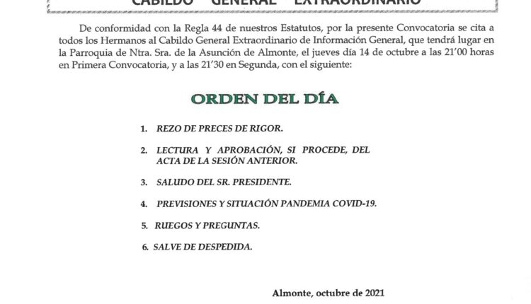 Cabildo Extraordinario día 14 de octubre de 2021 a las 21 horas en primera convocatoria y a las 21,30 horas en segunda convocatoria. Hemos dado …
