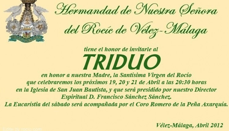 Solemne Triduo que celebra la Hdad. de Vélez Málaga los días 19,20 y 21 de abril en la iglesia de San Juan Bautista.