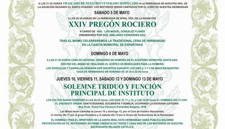 La Hdad. de Algeciras celebra el sábado 28 de abril el Pregón Rociero y los días 9,10 y 11 de mayo el Solemne Triduo en …