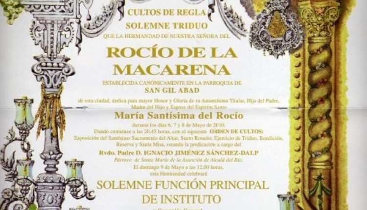 Desde hoy, hasta el próximo domingo día 9 de mayo de 2010, la Hdad. de Ntra. Sra. del Rocío de Sevilla-Macarena, celebrará Solemne Triduo en …