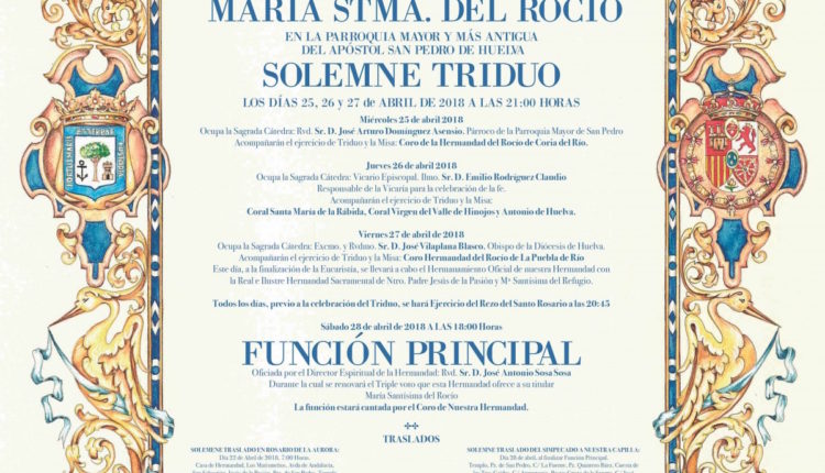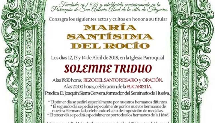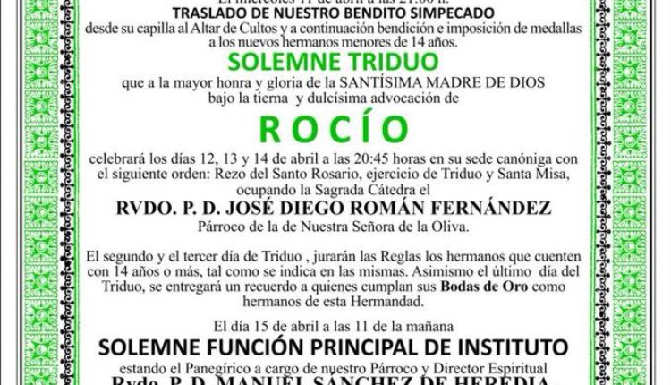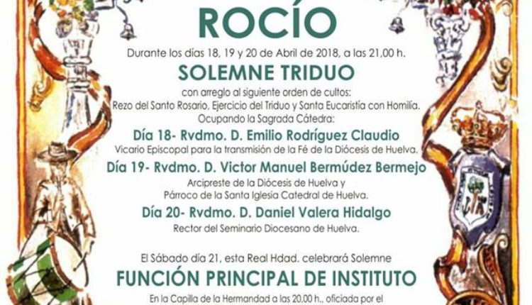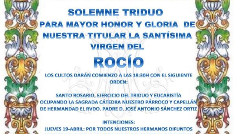 Solemne Triduo en honor a nuestra Amantísima Titular, Nuestra Señora del Rocío 17, 18 y 19 de Abril Parroquia de la Purísima Concepción Rosario: 20:15h …