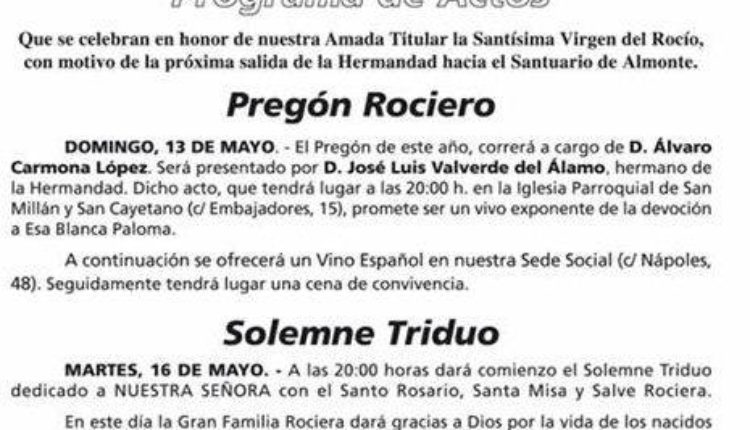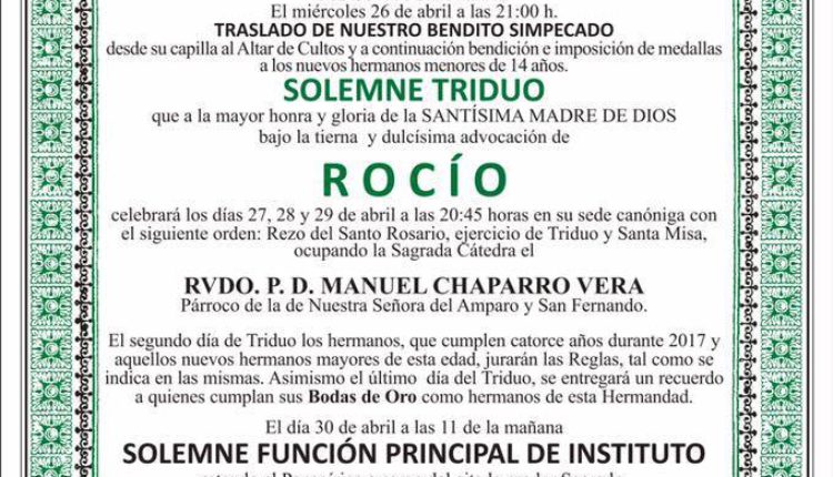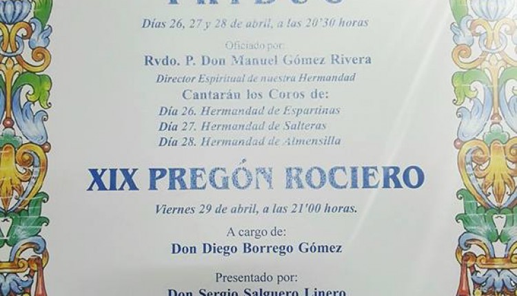 La Hermandad del Puerto de Santa María celebra Solemne Triduo y XLVI Pregón del Rocío a cargo de D. Carlos Alejandro Díaz Moreno.