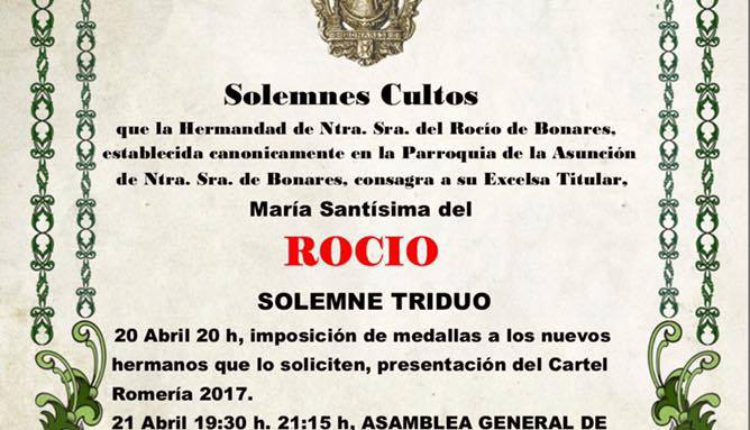 La Hermandad de Bonares celebra Solemne Triduo los días 20,21 y 22 de abril de 2017