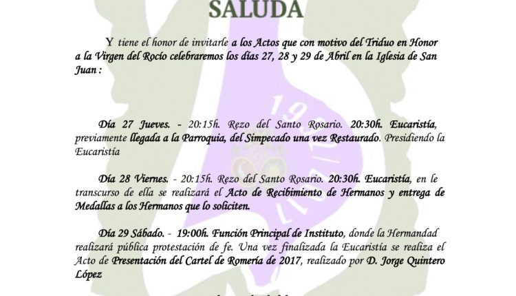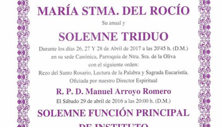 Los días 20, 21 y 22 nuestra Hermandad consagra un Solemne Triduo en honor de nuestra titular , la Stma. Virgen del Rocío. El martes …