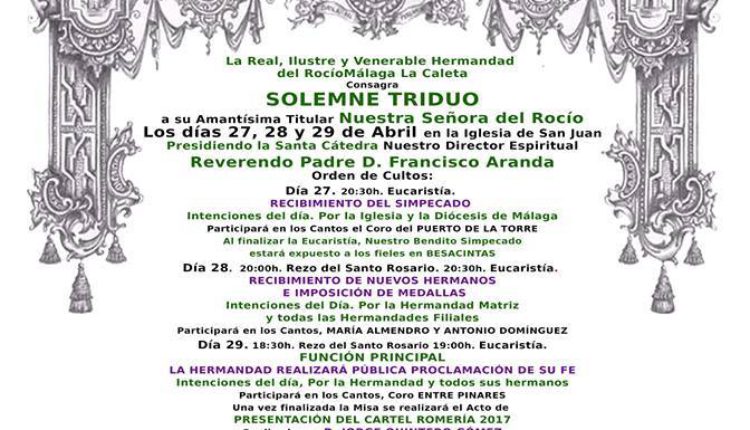 La Hermandad de Málaga.La Caleta celebra Solemne Triduo y Presentación del Cartel Romería 2017