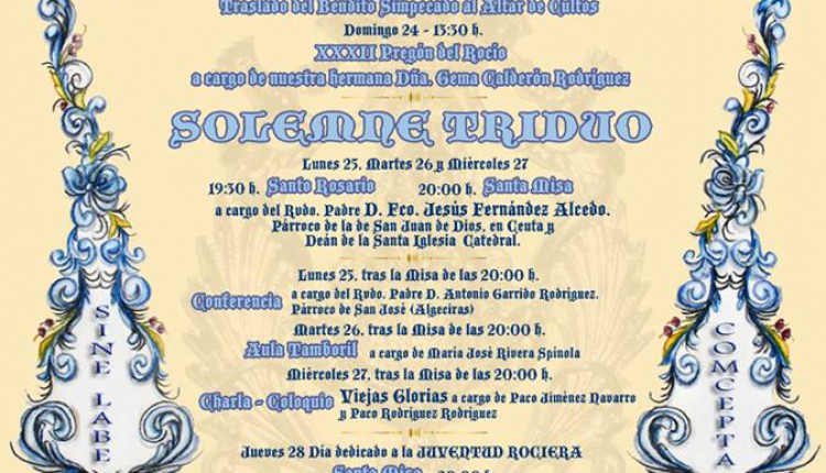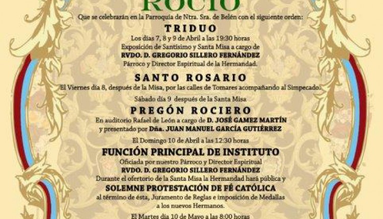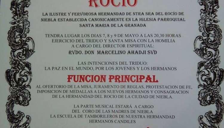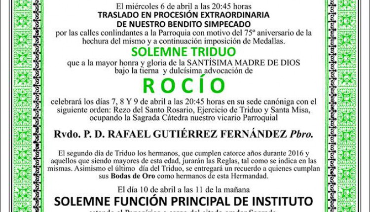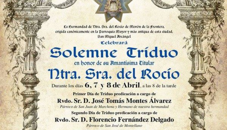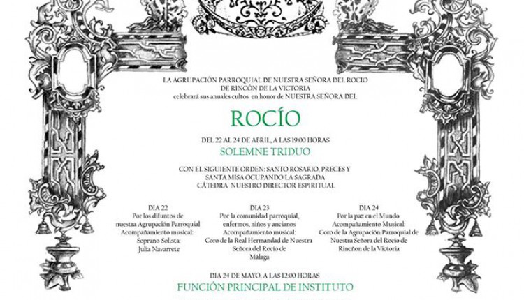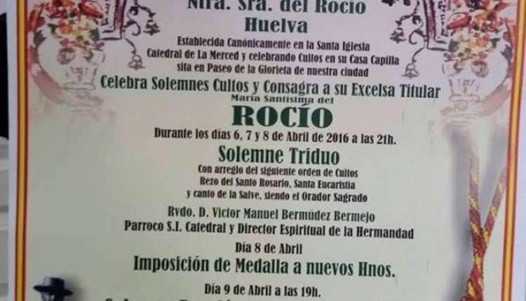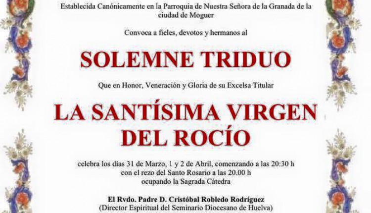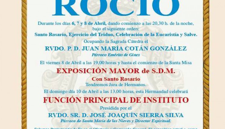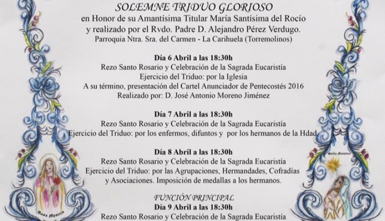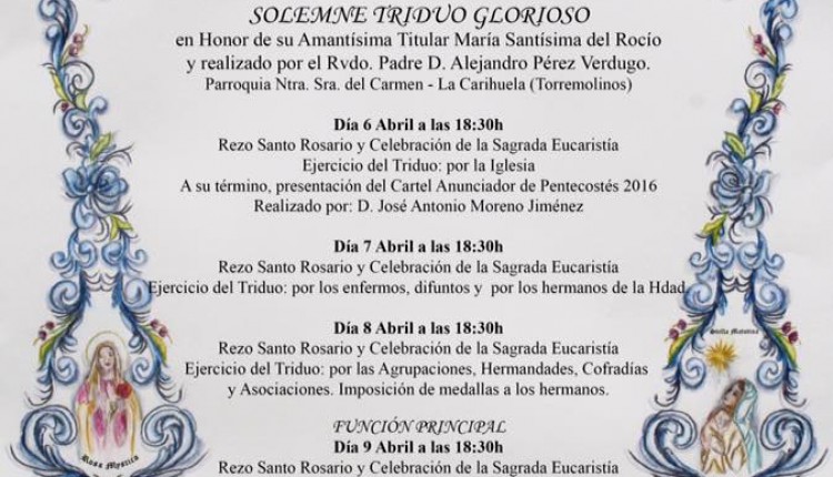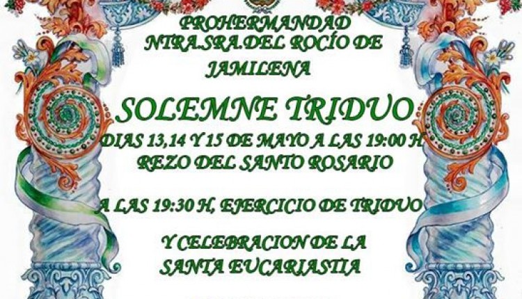Solemne Triduo de Gloria en Honor de la Santísima Virgen del Rocío que celebramos los días 6, 7 y 8 de mayo a las 20:45 horas, …