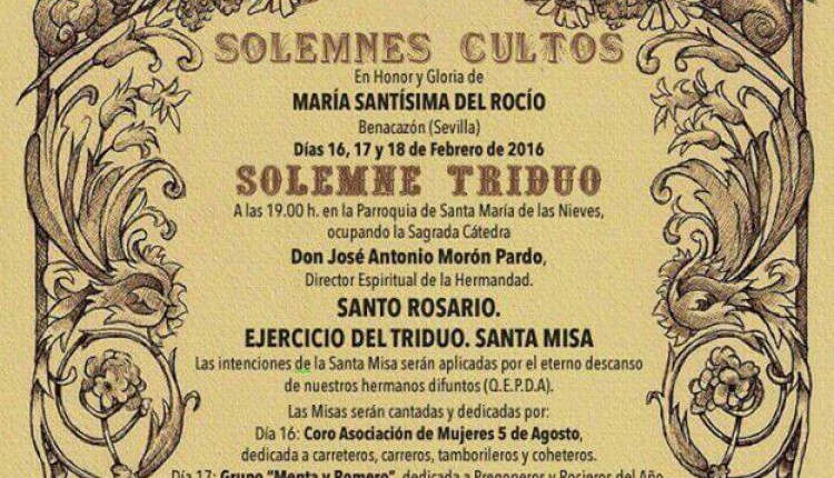 La Hermandad de Benacazón celebra Solemne Triduo los días 16,17 y 18 de febrero de 2016.