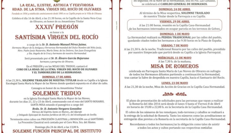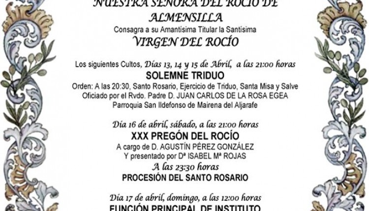 La Hermandad de Almensilla celebra Solemne Triduo los días 13,14 y 15 de abril de 2016. El 16 de abril, Pregón Rociero a cargo de Agustín …