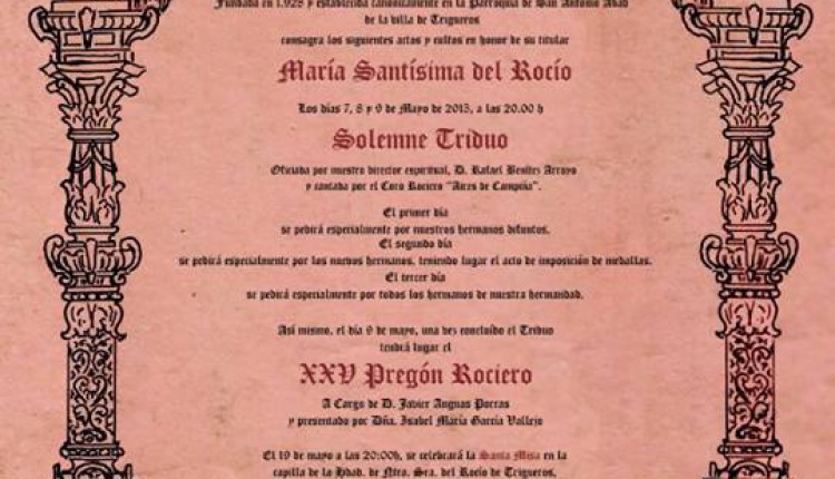 La Hermandad de Trigueros celebra Solemne Triduo y Pregón Rociero 2015 a cargo de D. Javier Anguas.
