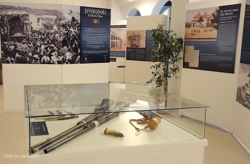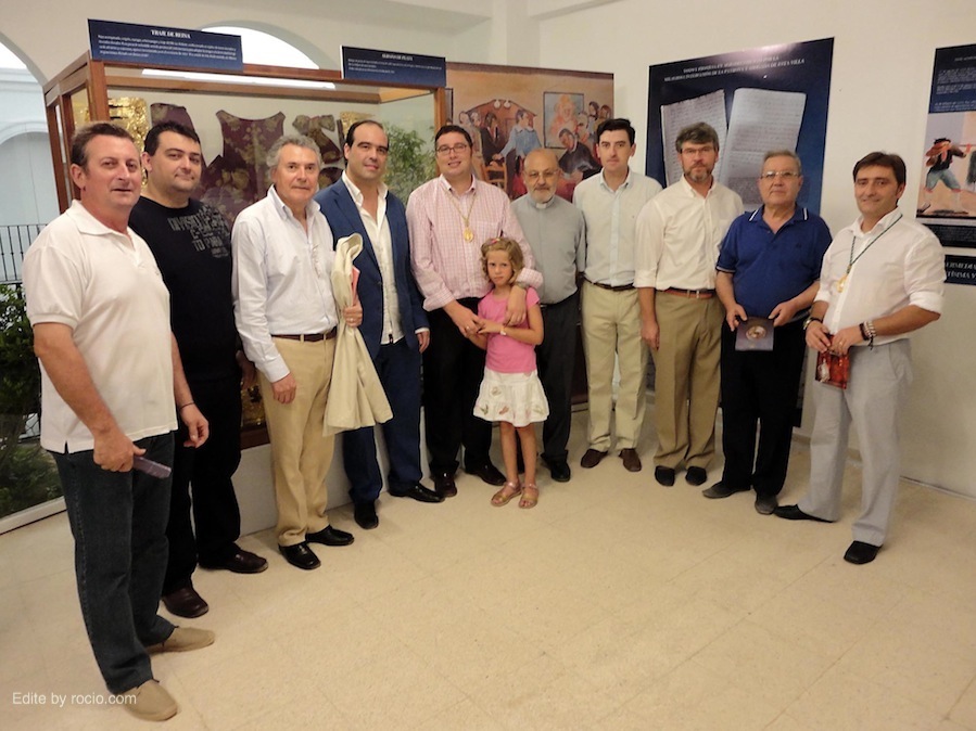 Exposición INTERCESORA DE ALMONTE. El Rocío Chico 1810-1813/2010-2013. En el grupo aparecen además del Presidente y del Capellán y director Espiritual, las personas que de un modo u otro han intervenido, en la coordinación, diseño y montaje de la exposición. Entre ellos, el comisario de la muestra, Julio Mayo, y el ilustrador de las imágenes, Emilio Gavira.