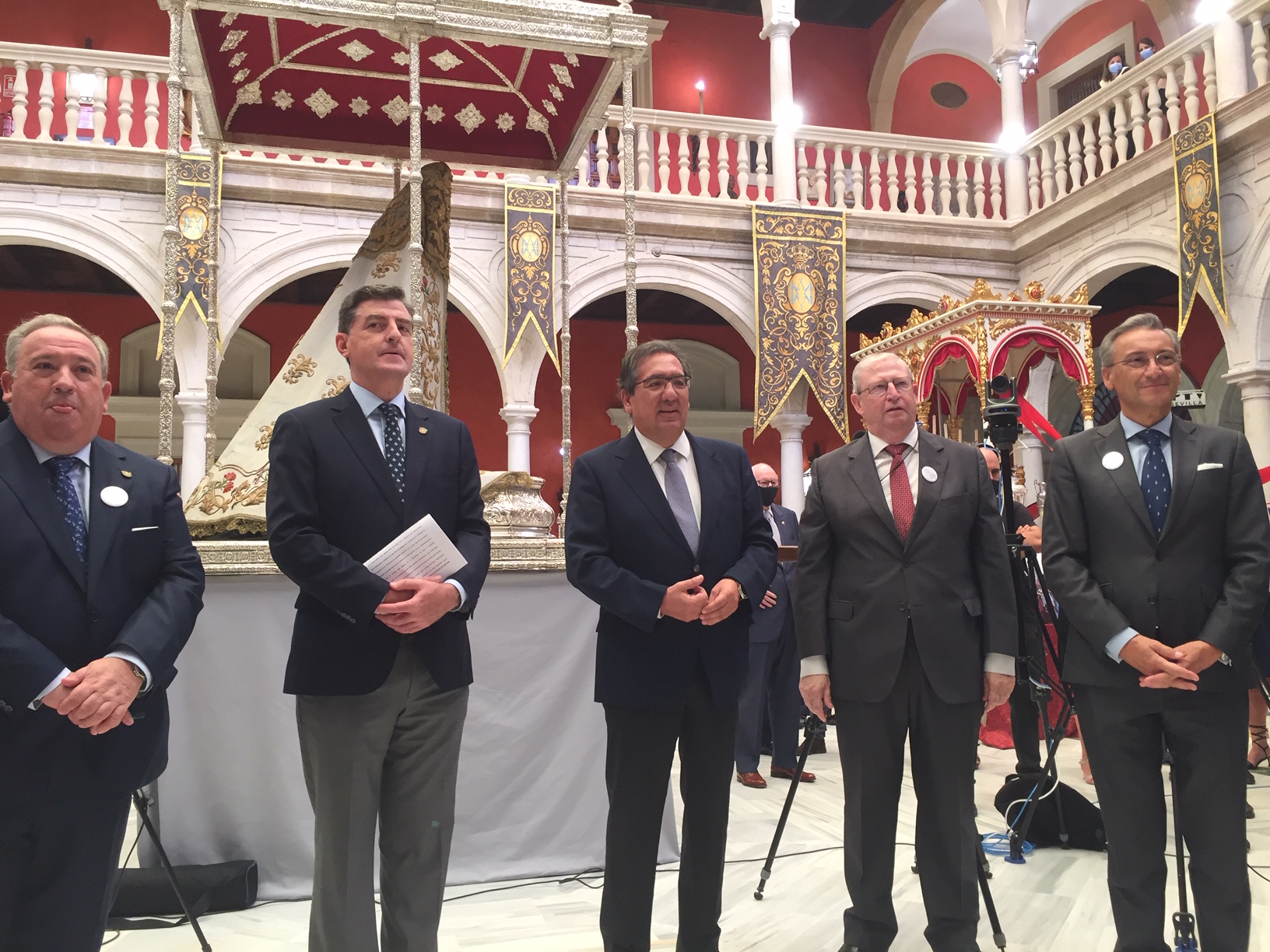 La Fundación Cajasol de Sevilla ha acogido esta mañana la inauguración de la Magna Exposición Jubilar Rocío que se desarrollará hasta el próximo 13 de noviembre. El acto comenzó con el rezo del Ángelus ante la imagen de la Virgen del Rocío de la Colegial del Divino Salvador, a la que se le hizo una ofrenda floral, mientras sonaban sevillanas. La comitiva, marchó desde la plaza de Salvador hasta la de San Francisco donde dio comienzo el acto de apertura que ha sido amenizado por sones de tamborileros. Y que ha contado con la participación en la palabra del presidente de la Fundación Cajasol, Antonio Pulido, el presidente de la Hermandad Matriz de Nuestra Señora del Rocío de Almonte, Santiago Padilla y el comisario de la muestra, Antonio Lebrero. Además, de la presencia de diferentes autoridades y hermanos mayores y presidente de hermandades filiales.