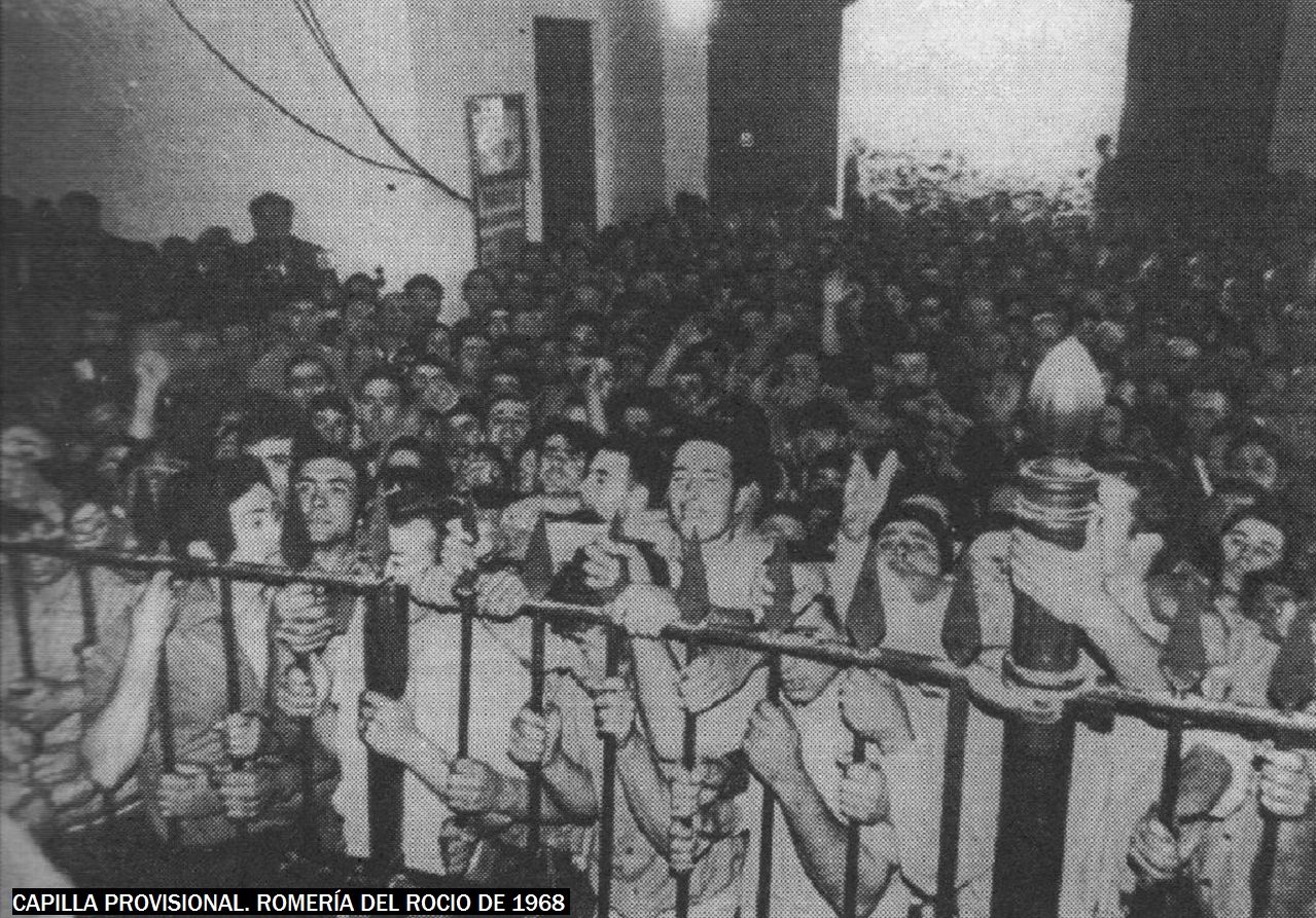Almonteños bravíos a la espera junto a la antigua reja de «pinchos» para cumplir un año mas el ritual de procesionar a su patrona. Romería del Rocío de 1968, el último año que la Virgen viviría su fiesta de Pentecostés dentro de la capilla provisional.