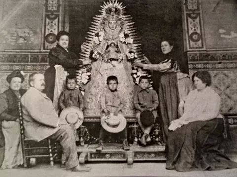 Es una fotografía realizada en 1917. Arriba junto a la Virgen; A la izquierda Dolores Acevedo y a la derecha, su madre, la camarista Anita Valladolid. Abajo, el señor que esta sentado es Julio Medina González, secretario del ayuntamiento y Hermano Mayor de la Matriz en 1923, sentado junto a su señora. Los Niños son; Leoncio, Manuel Corona y Curro Corona.